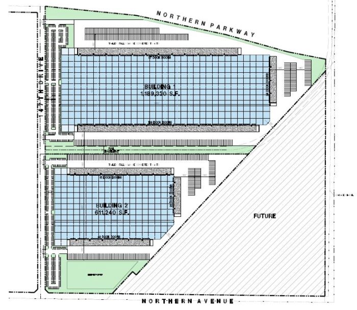 At completion, NorthPark Logistics Center will feature two Class AAA industrial facilities totaling 1,700,000 sf. Building 1 will be a 1,100,000 sf cross dock facility that features Northern Parkway frontage, 40’ clear height, 195’ truck court depth, 315 trailer stalls, and 435 parking stalls. Building 2 will be a 600,000 cross dock facility featuring 40’ clear height, 195’ truck court depth, 220 trailer stalls, and 295 parking stalls. Located nearby the interchange of the newly-constructed Northern Parkway and Loop 303 in Glendale, NorthPark benefits from incredible freeway visibility, direct access to the Northern Parkway, and excellent regional connectivity to the greater southwest United States